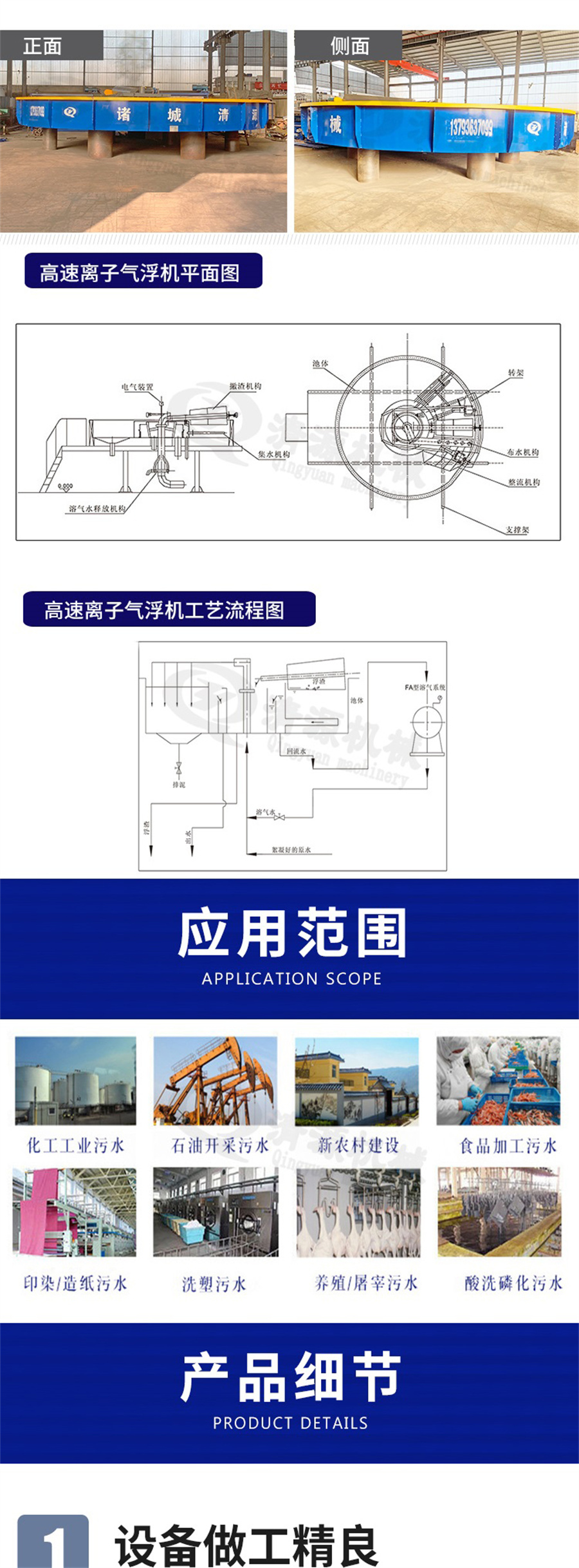 四、高速离子气浮机应用范围:该设备以更好的设计,优良的性能,广泛应用于石油、化工、钢铁、制革、电力、纺织、食品、酿造、市政等行业的污水处理系统,是传统气浮设备的替代产品。