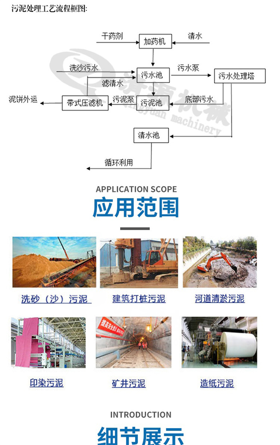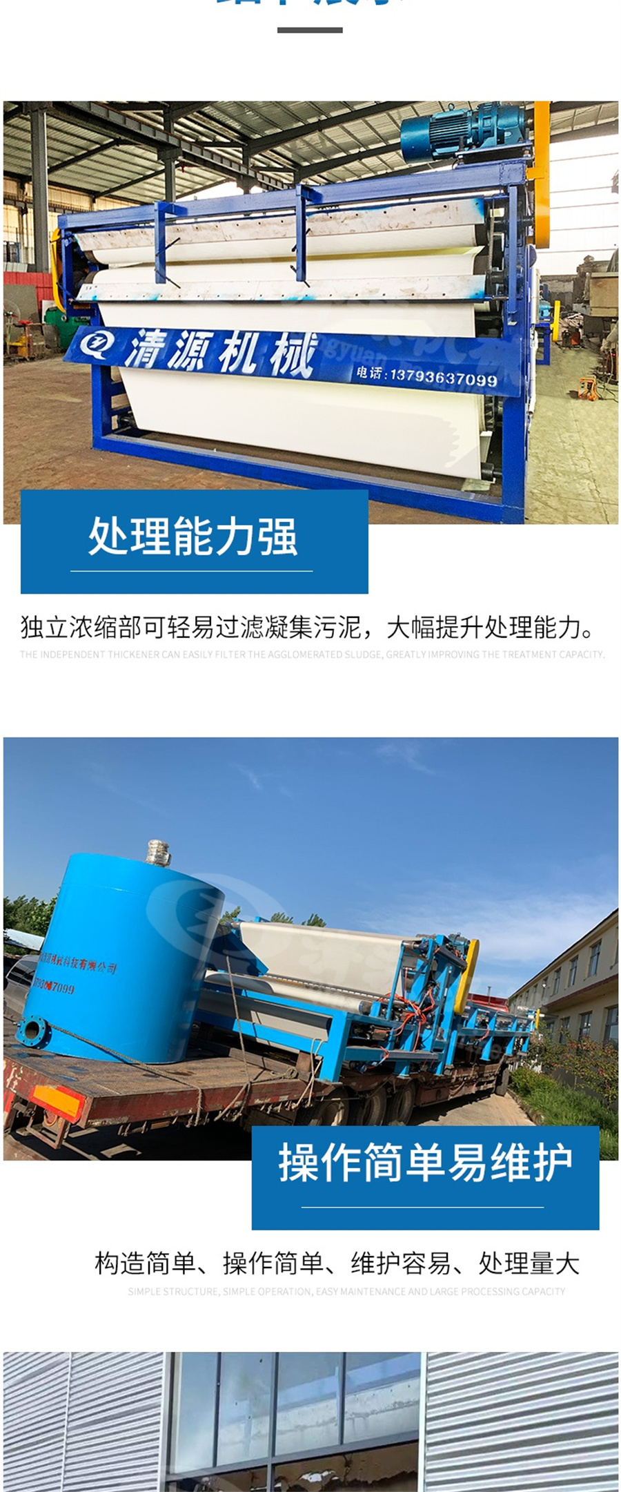 洗沙污水处理设备主要由驱动装置、机架、压榨辊、上滤带、下滤带、滤带张紧装置、滤带清洗装置、卸料装置、气控系统、电气控制系统等组成。