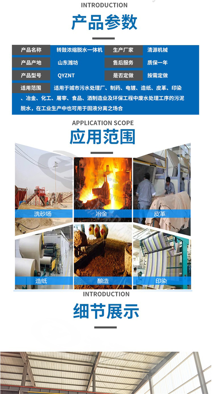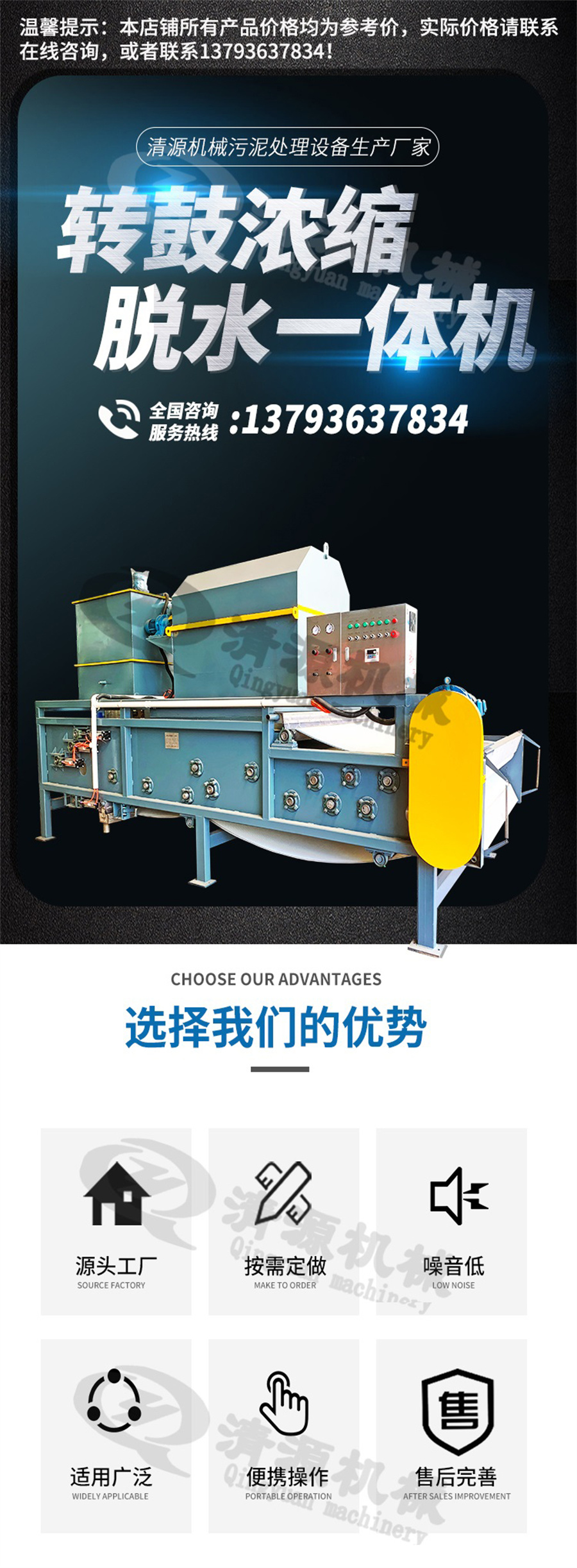 诸城清源机械科技有限公司生产的转鼓浓缩带式污泥脱水一体机处理前含固体颗粒含水率:99.4%-98%处理后的含水率:小于80%(可以直接运输填埋或焚烧)。