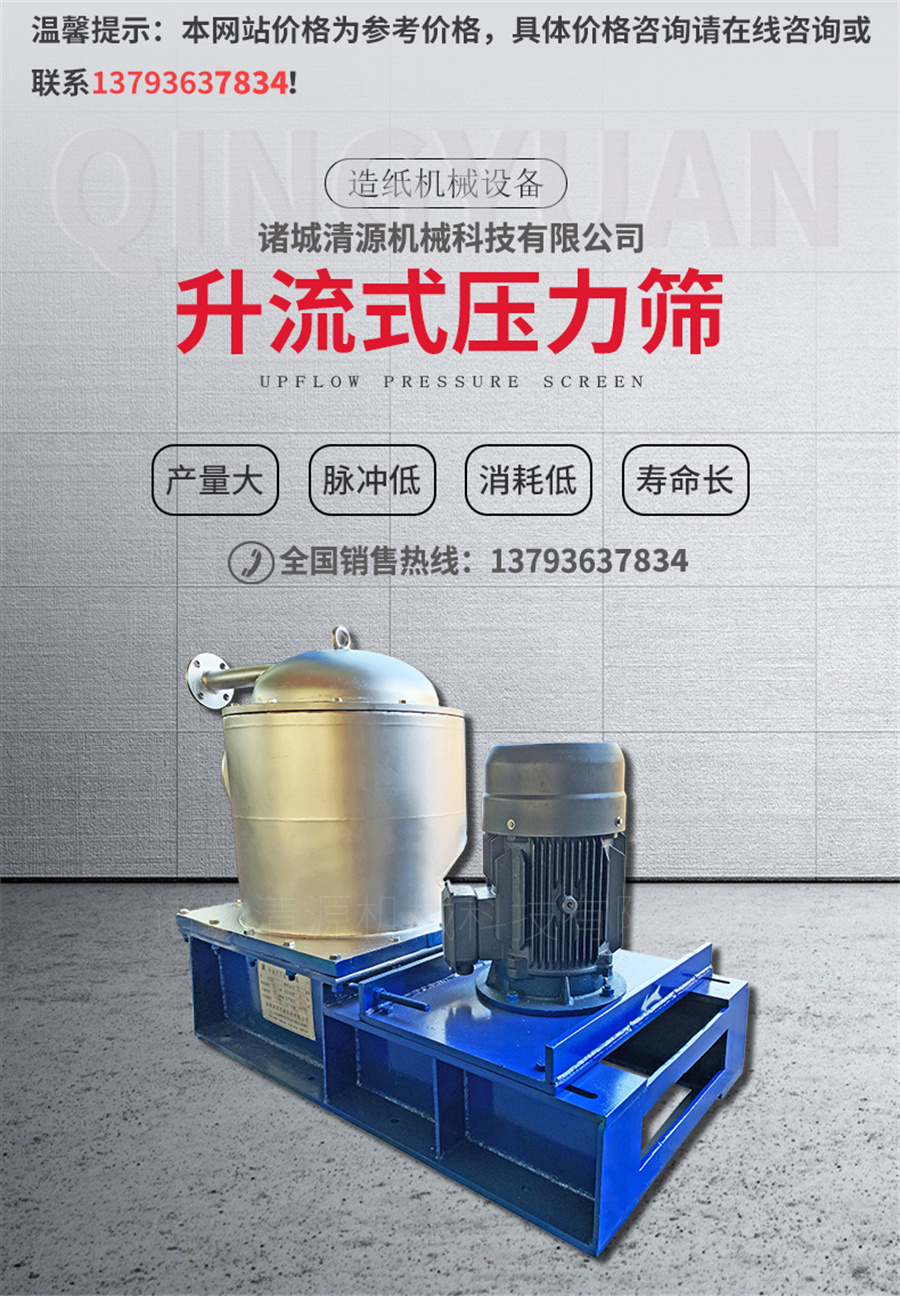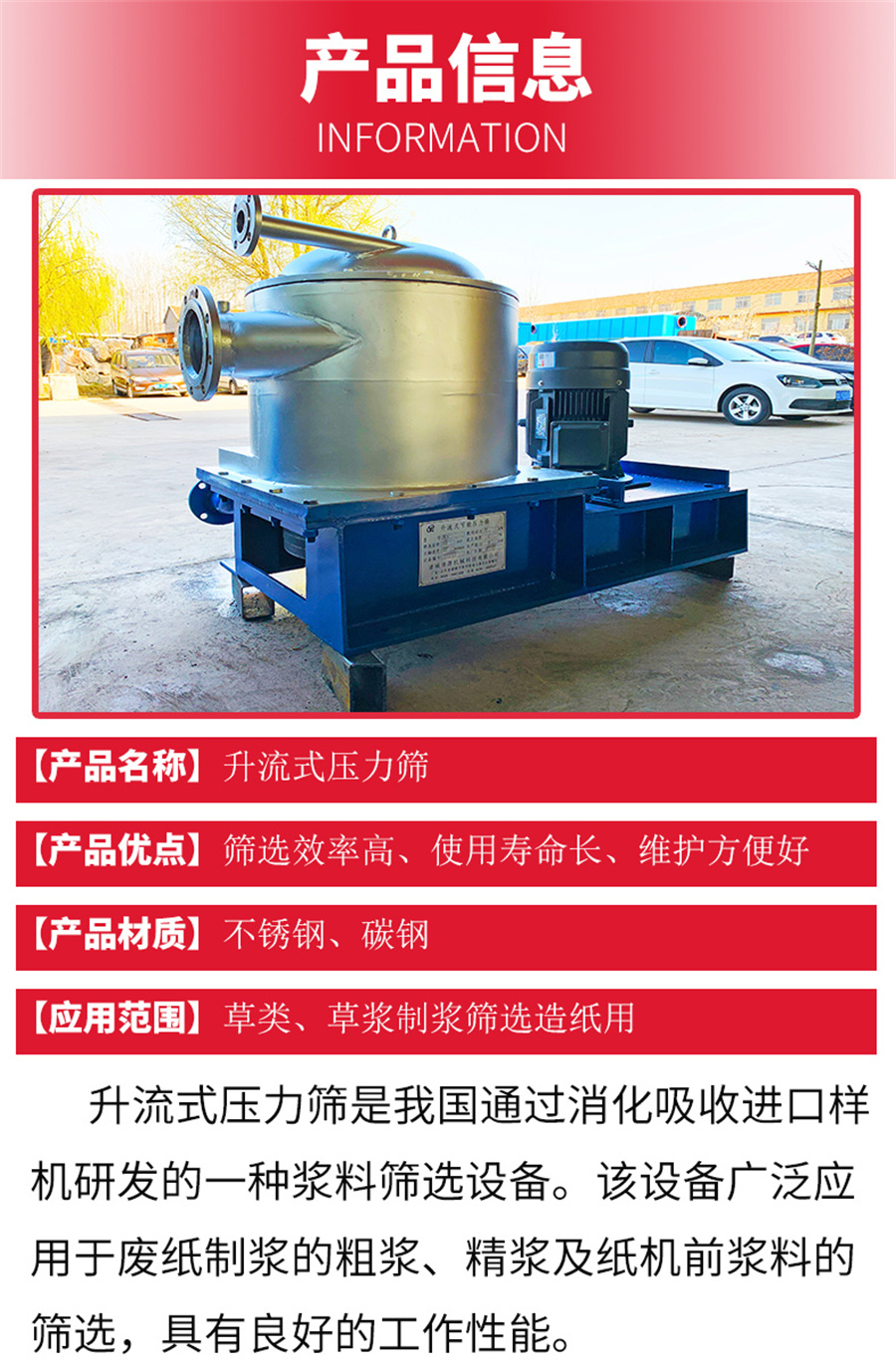 升流式压力筛作为制浆造纸的通用设备,压力筛有着不可替代的作用。 我公司生产的升流式压力筛、内流式压力筛及多级筛自2001年进入市场以来创下了年产二百多台的辉煌成绩。目前公司生产的压力筛可用不锈钢(304)和A3板两种材料制作,精铸304叶片和转子,进出浆管路(浆料浓度)可选用自动控制,既减少了人工操作,又提高了生产效率。筛鼓采用进口技术加工制作,筛缝据均匀,开孔率高,耐磨,使用周期长。 主要用于纸机前低浓浆料的筛选,能有效的去除杂质和疏散浆料,从而提高纸张质量。